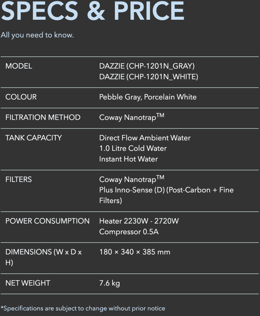 1. Sleep Mode – Jika tidak digunakan selama satu jam, Coway DAZZIE akan masuk ke Mod Tidur untuk mengurangkan penggunaan tenaga.
