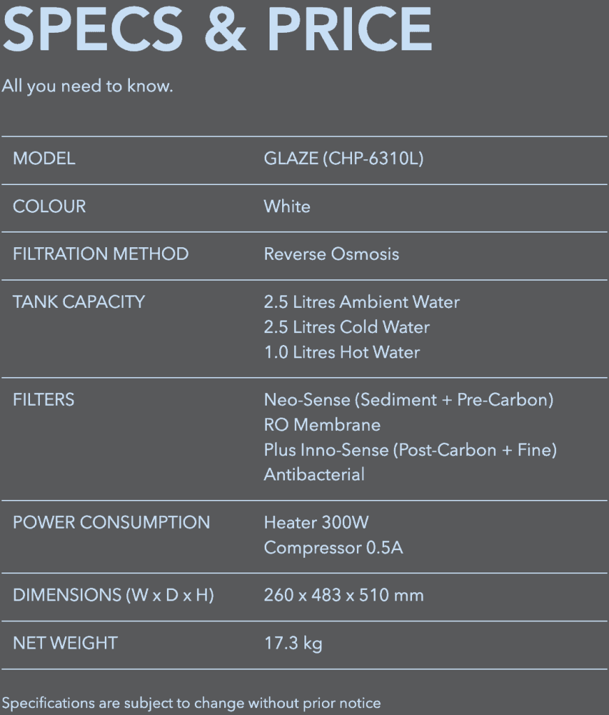 Coway Glaze lebih sejuk dari biasa yang menggunakan teknologi pemisahan antara air biasa dan sejuk. Ini akan bantu mengekalkan suhu air sejuk serendah 4.4 darjah celcius! Dan model ini menggunakan tapisan air RO yang sememangnya 99% bersih dan diiktiraf Badan Kesihatan Dunia.